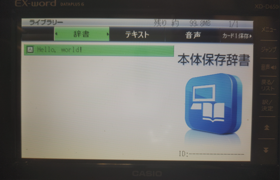 build.zipを解凍して、build/ja/HELLO フォルダの中身を /root/.local/share/exword/ja/HELLOにコピーしました。