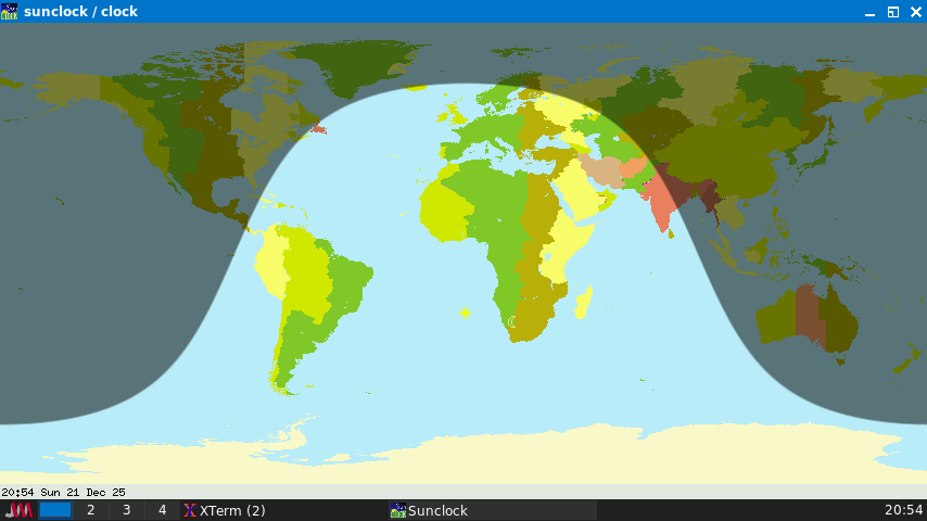 sunclock は、世界地図を表示し、昼の地域を明るく、夜の地域を暗く描画 することにより、地球に太陽光が照らされた地域を示します。 デフォルトのタイムゾーンに対するローカルタイムを示すだけでなく、 主要な都市の GMT 時間、法定時および太陽時、都市の緯度経度、 地球上の任意の二点間の距離を表示できます。 Sunclock は、経線、緯線、南北回帰線および極圏を表示できます。 時間の進み方を加速し、四季の移り変わりを表示する組み込み機能を 有しています。