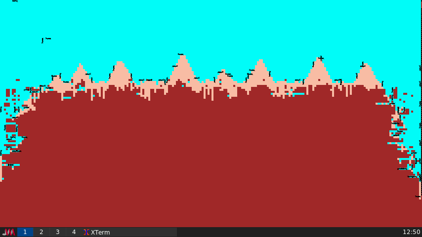 アリの世界には三つの元素があります:空気、土、砂です。 アリは空気中を移動し、土を掘り起こし、それを砂として落とします。 アリには3つの行動があります:さまよい、運搬する、パニックです。 プログラムにはいくつかの簡単な確率が組み込まれています これは、放浪と運搬の間の切り替えを制御します。 パニックになるのを見るには、カーソルでアリをつついてみてください。