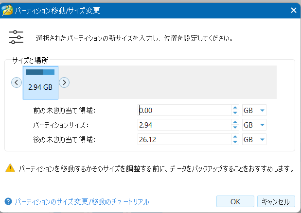 「どのくらいの空き領域を利用しますか?」のスライダーを一番右側に移動して、