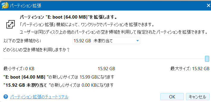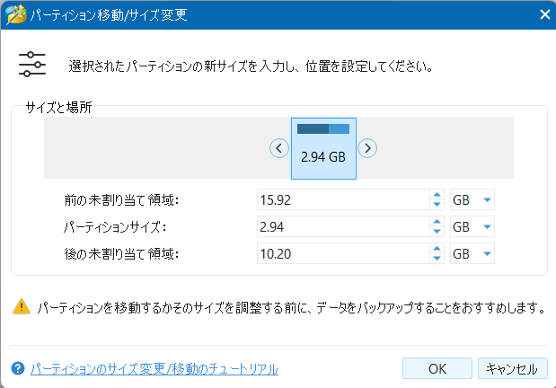 グロックを右に移動して、「前の未割り当て領域」を0.00->15.92になるまで移動します。