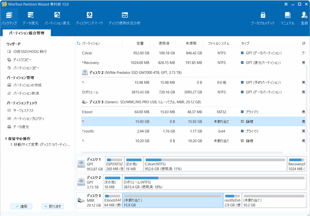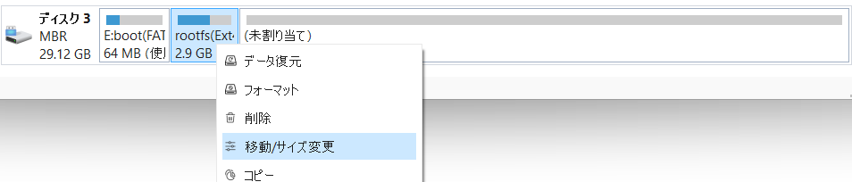 Linux領域であるrootfs(Ext4)を選択して、右クリック->移動/サイズ変更をクリックします。