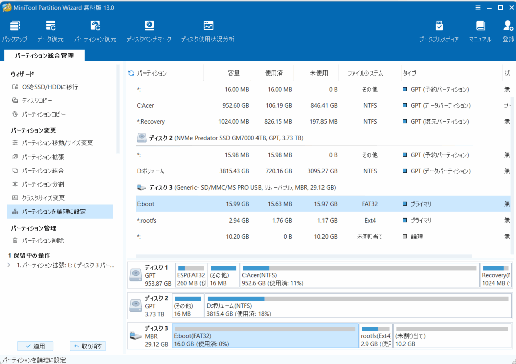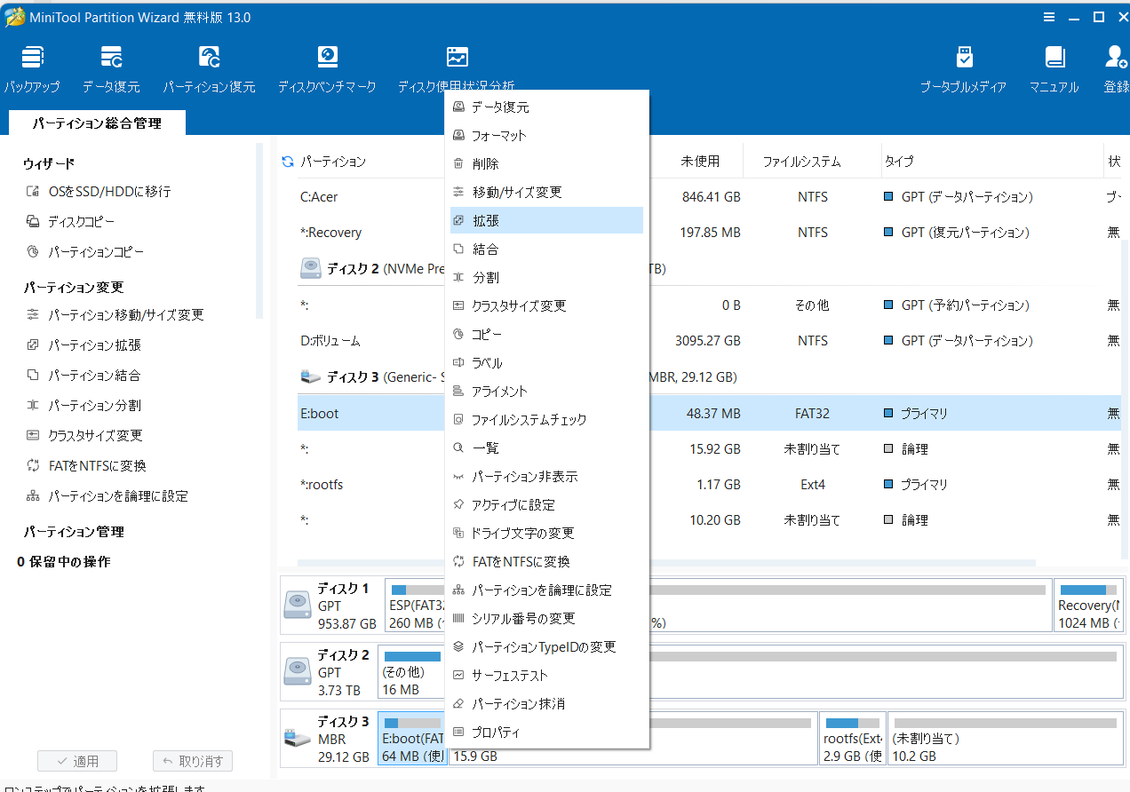 FAT32領域であるboot(FAT32)をクリックして、「拡張」をクリックします。