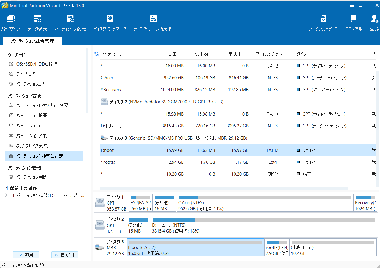 先ほど確認した通り、WinCEでも利用できるFAT領域が64MBなので、MicroSDの空き容量を使って拡張してみます。