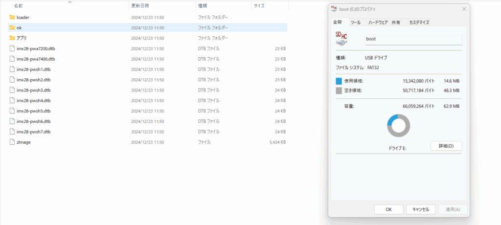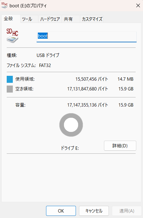 SDカードのFAT32領域の状態をWindowsから見ると、容量15.9GBに拡張されています。