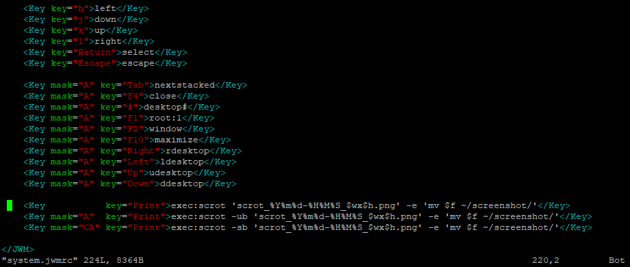 <Key mask=”A” key=”Print”>exec:scrot -ub ‘scrot_%Y%m%d-%H%M%S_$wx$h.png’ -e ‘mv $f ~/screenshot/'</Key>