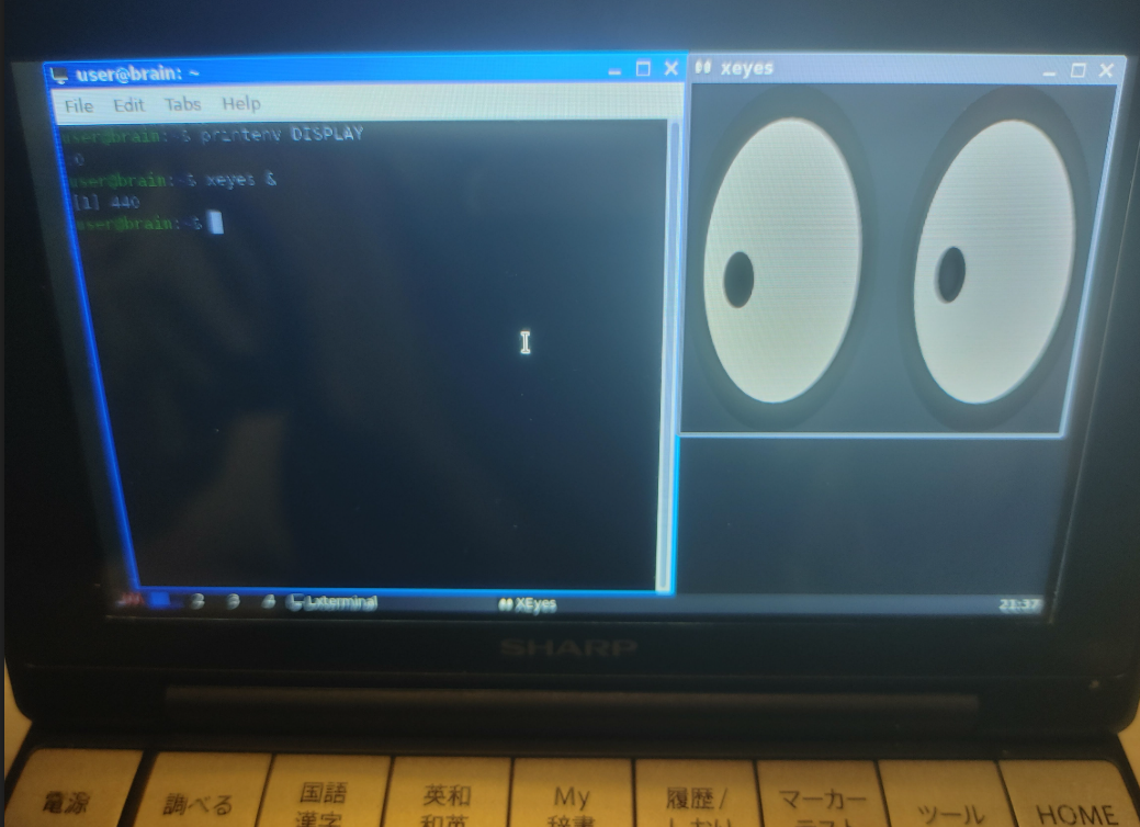user@pc1:~$ ssh user@192.168.29.11 login as: user user@192.168.29.11's password: Linux brain 5.4.149-gaa3edcd5fcbc #2 PREEMPT Mon Dec 23 11:34:55 UTC 2024 armv5tejl ____ _ | _ \ (_) | |_) |_ __ __ _ _ _ __ _ ___ __ | _ <| '__/ _` | | '_ \| | | \ \/ / | |_) | | | (_| | | | | | |_| |> < |____/|_| \__,_|_|_| |_|\__,_/_/\_\ by Brain Hackers https://github.com/brain-hackers Last login: Sun Nov 9 15:00:04 2025 from 192.168.29.19 user@brain:~$ printenv DISPLAY user@brain:~$ export DISPLAY=:0 user@brain:~$ printenv DISPLAY :0 user@brain:~$ xeyes & [1] 1770 |