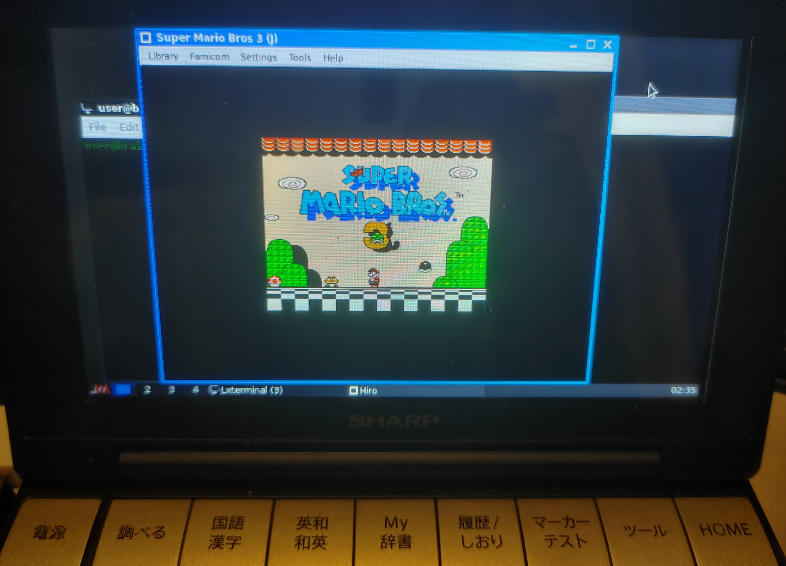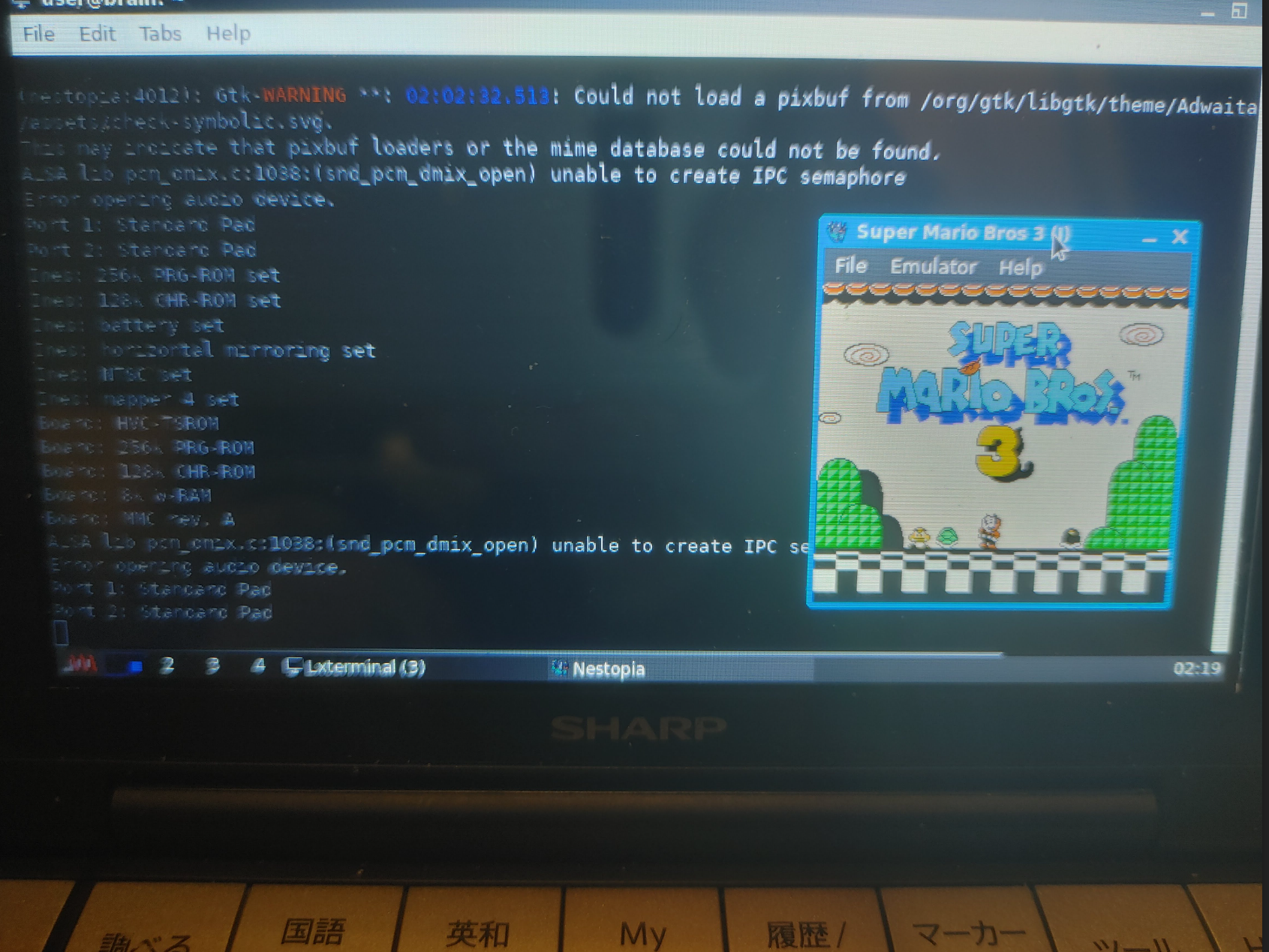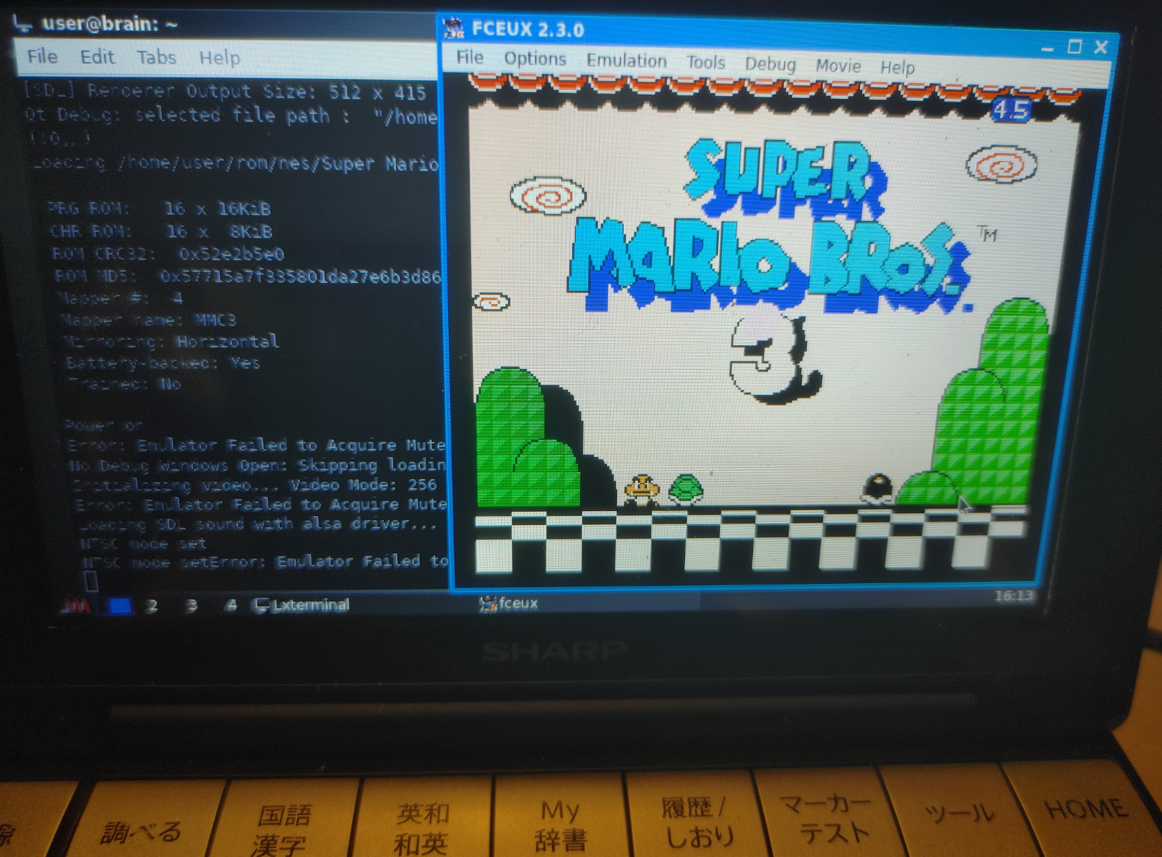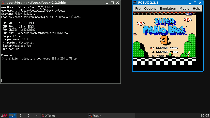Brainでapt経由でインストールできる fceux2.3.0(SDL2.0版)だと動作速度遅すぎて、4-5fpsしかでない&キー入力も怪しいという状況でした。