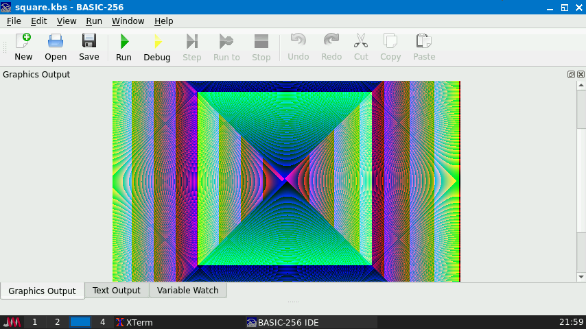 1234567891011121314151617 #!/usr/bin/yabasicw = 400open window w, wsleep 1label againbackcolour 0,0,0clear windowfor i=0 to w step 5v = 255 * i / wcolor 0, v, (255 - v)line 0, i, i, wcolor (255 - v), 0, vline i, 0, w, ipause 0.025next isleep 3goto again