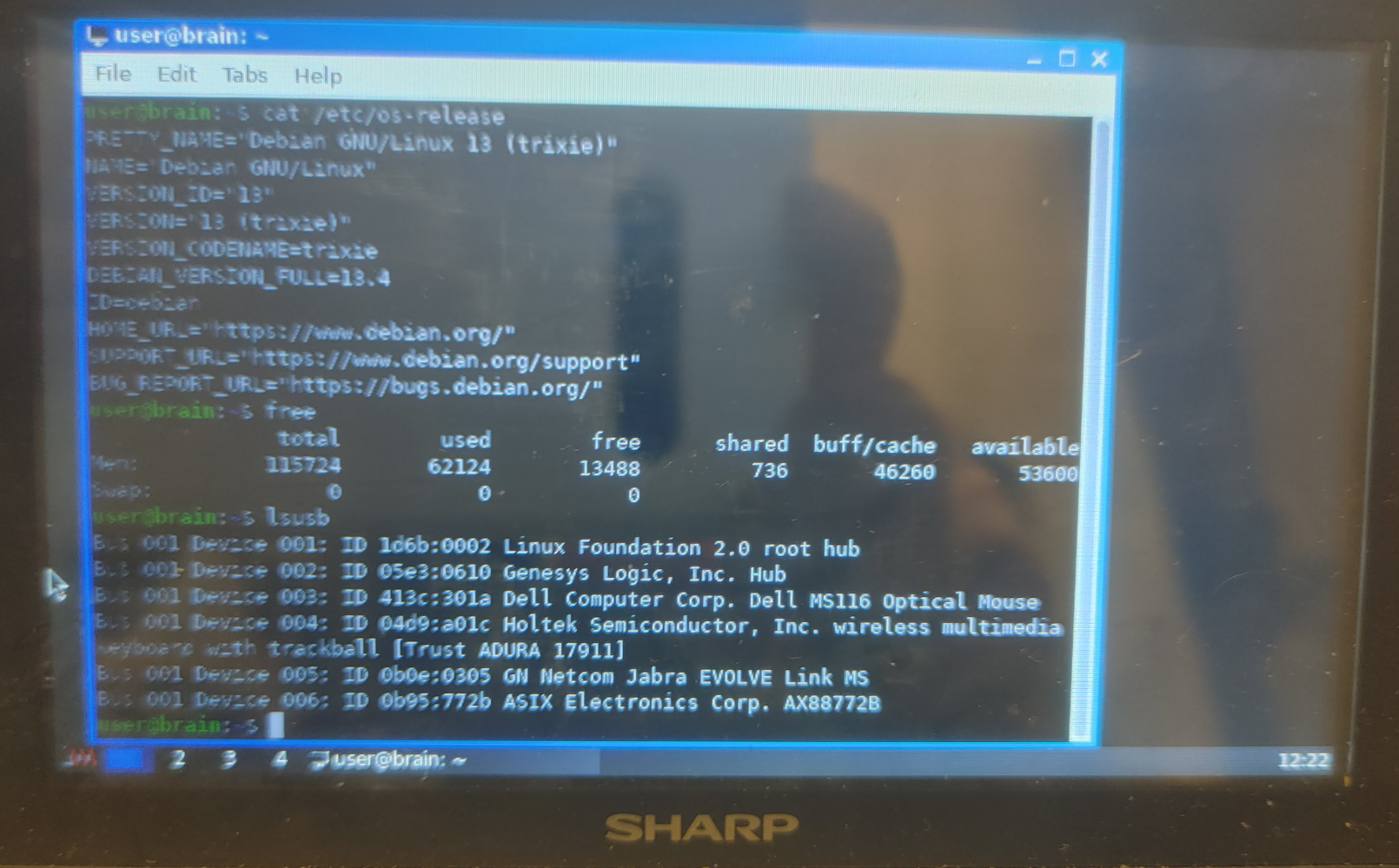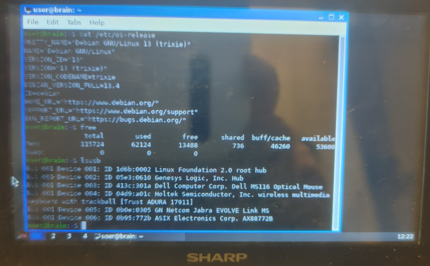 user@brain:~$ uname -a Linux brain 6.1.70-ga9f534c7f53e #1 PREEMPT Tue Mar 24 17:57:31 UTC 2026 armv5tejl GNU/Linux user@brain:~$ cat /etc/debian_version 13.4 user@brain:~$ cat /etc/os-release PRETTY_NAME="Debian GNU/Linux 13 (trixie)" NAME="Debian GNU/Linux" VERSION_ID="13" VERSION="13 (trixie)" VERSION_CODENAME=trixie DEBIAN_VERSION_FULL=13.4 ID=debian HOME_URL="https://www.debian.org/" SUPPORT_URL="https://www.debian.org/support" BUG_REPORT_URL="https://bugs.debian.org/" user@brain:~$ |